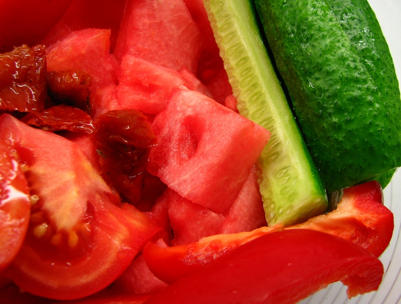 Alapanyagok: paradicsom, paprika, uborka, aszalt paradicsom és dinnye.