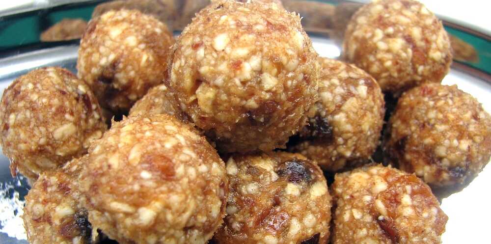 A receptben datolya és aszalt sárgabarack szerepel, de ki lehet próbálni másfajta aszalt gyümölcsökkel is. A boltban vásárolt aszalt datolyát, sárgabarackot érdemes kisebb darabokra vágni, mielőtt az aprítógépbe tesszük.