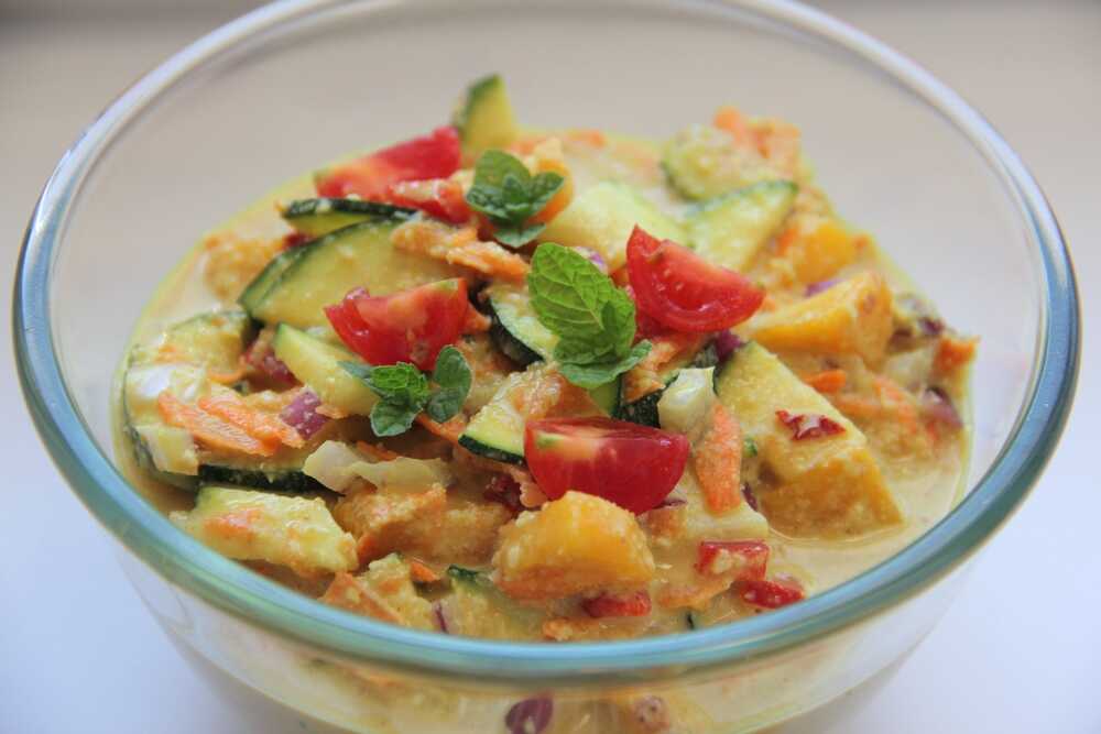 Ez a nyers zöldségcurry egy közkedvelt változat, érdemes kipróbálni. Amíg még meleg van, jól esnek a nyers zöldségek, és még a tűzhelyet sem kell bekapcsolni.