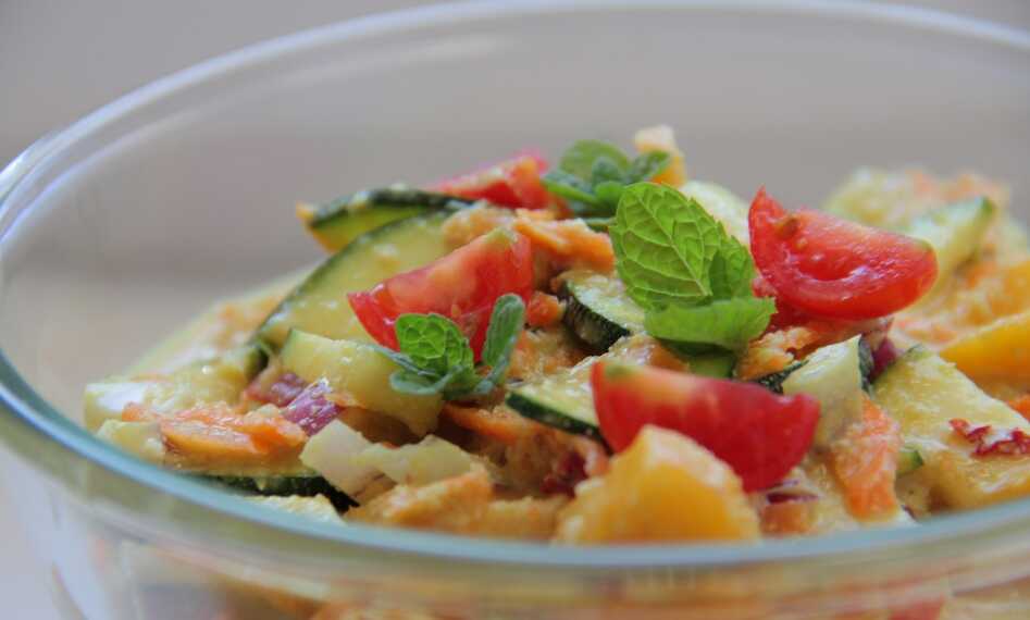 Két részből áll ez az étel, az egyik a feldarabolt zöldségek, a másik pedig a szósz. Felfoghatjuk úgy is, mint egy újfajta salátát: a saláta zöldségekhez egy különleges, currys öntetet készítünk.