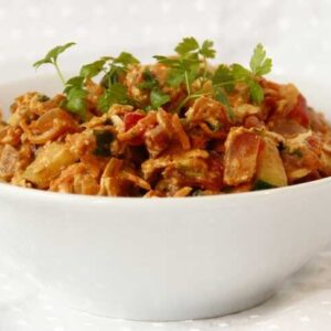 Tulajdonképpen ez egy meleg étel, egy tofus, zöldséges ragu. Főételnek sós palacsintába töltve, vagy hidegen kenyérrel egyaránt jó választás, sokoldalúan használható, variálható.