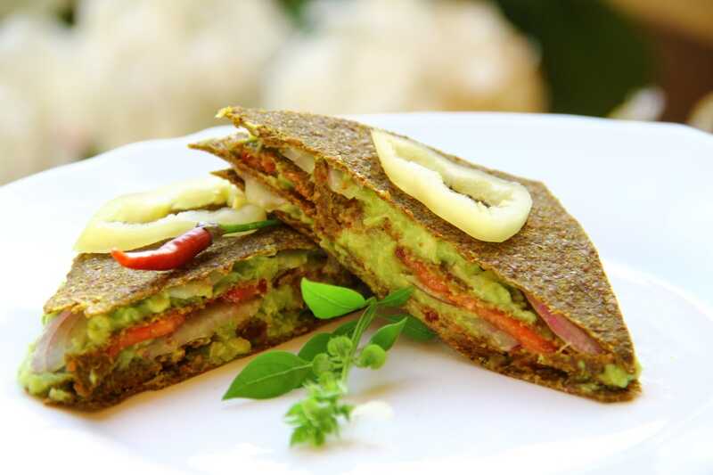 Ennek a szendvicsnek egy lenmagos nyers kenyér, egy sós palacsinta az alapja. Nehéz jó nevet találni neki, mert a hagyományos konyhában nincs párja. Akkor most röviden összefoglalom: sós, vékony, lenmagos, nem is ropogós, de nem is teljesen hajlékony, valahol a kettő között van, nyers, vagyis aszaljuk, és zöldséges, mert van benne zeller és sárgarépa is.