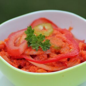 A darabos részhez a hozzávalókat kis kockákra vágjuk. Ízlés szerint vághatunk bele cukkínit is. Ha csípős paprikát is teszünk bele, igazi ínyencség lesz....
