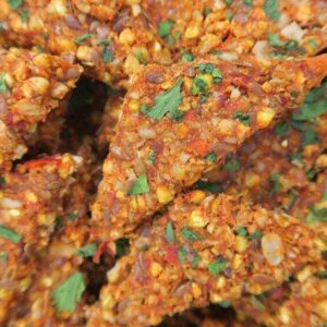 Minden összetevőt egymás után morzsásra megaprítunk a konyhai aprítógéppel. Akinek van Thermomix, az természetesen azt használja, 5,5 fokozaton. A végén sózzuk, fűszerezzük, jól összekeverjük a masszát.
