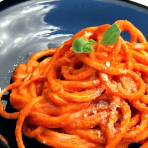 Retekspagetti paradicsomos öntettel, mandula parmezánnal