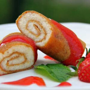 A túrókrémet négyfelé osztjuk, egyenletesen szétkenjük a gyümölcslapokon, majd feltekerjük. Tálaláskor felvágjuk a palacsintákat és meglocsoljuk az eperszósszal.